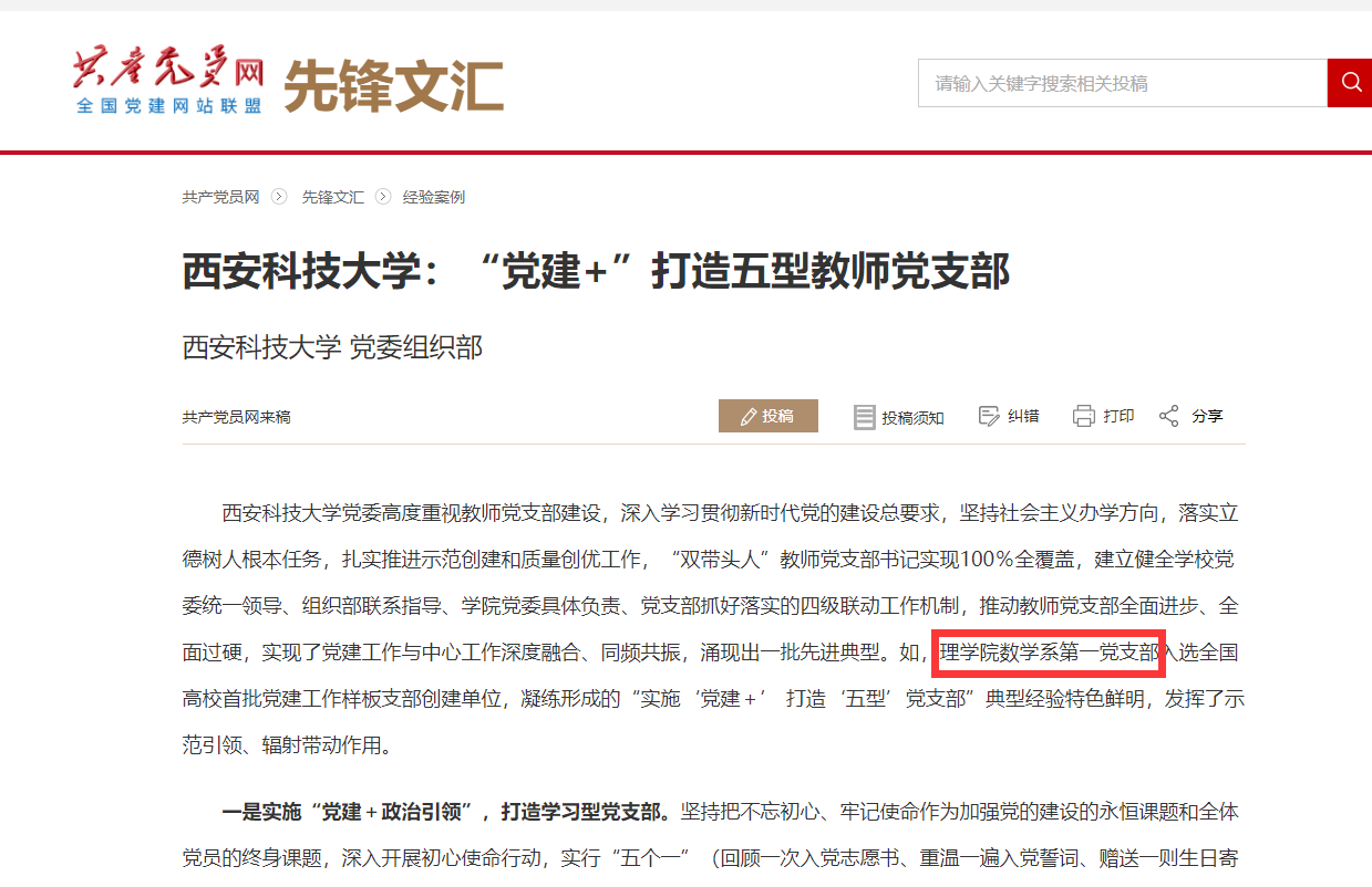 二是实施“党建+平台建设”,打造阵地型党支部。依托全国高校思想政治工作网、SUNBET申博官网、“党旗飘飘数学系一支部”微信公众号,组建“三位一体”网络宣传平台,及时宣传上级党组织决策部署,定期发布党建工作动态,始终坚持团结稳定正面宣传,唱响主旋律,弘扬正能量。两年来,支部活动在全国高校思想政治工作网宣传报道90条,在“党旗飘飘数学系一支部”微信公众号发布宣传报106篇。特别是新冠肺炎疫情以来,支部自觉践行常态化疫情防控“四个一”行动,积极打造战“疫”教育素材库,构筑“红色防火墙”,引领师生听党话、跟党走,切实把思想和行动统一到党中央决策部署上来。