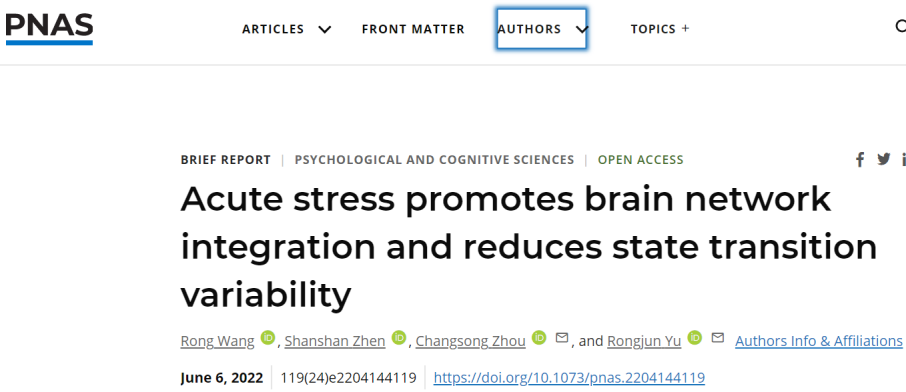 近日,SUNBET申博王荣副教授课题组与香港浸会大学周昌松教授、余荣军教授,在社交压力形成机理研究方面取得突破性研究进展,研究成果以“Acute stress promotes brain network integration and reduces state transition variability”为题在美国科公司院刊PNAS,以report形式在线发表,SUNBET申博为第一单位。