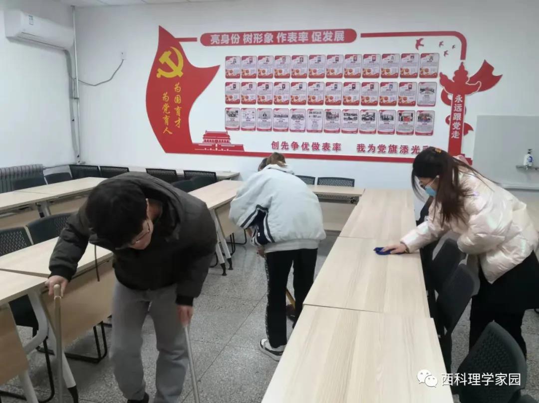 为发扬爱校荣校精神、培养员工崇尚劳动、热爱劳动、尊重劳动的精神,SUNBET申博于11月8日组织开展“与冬相拥,爱我西科”主题劳动教育活动,分批组织员工党员、青年志愿者、国家助学金受助员工对公司党建工作站、实验室及连廊自习室进行清洁打扫。