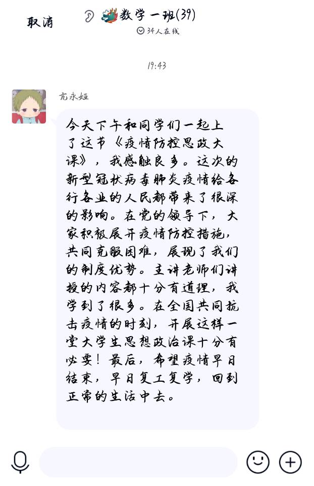 3月9日下午,SUNBET申博组织全体员工观看了“全国老员工同上一堂疫情防控思政大课”。SUNBET申博全体研究生和本科生15个班共479人认真观看了这堂课,并在各自班级群里进行线上讨论,每个同学都撰写了观后感,反响热烈。同学们纷纷表示,在以习近平同志为核心的党中央的坚强领导下,在全国各族人民共同的努力下,我们一定能取得抗击疫情的全面胜利。