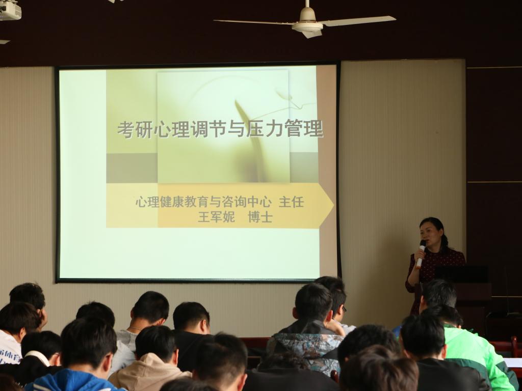 讲座一开始,王军妮告诉同学们考研不仅要身体力行,还要做好充分的心理准备。其次,讲了考试与压力的关系以及复习过程中的心理调节,她运用心理学知识结合自身经历,综合全面的对同学们进行了心理指导。