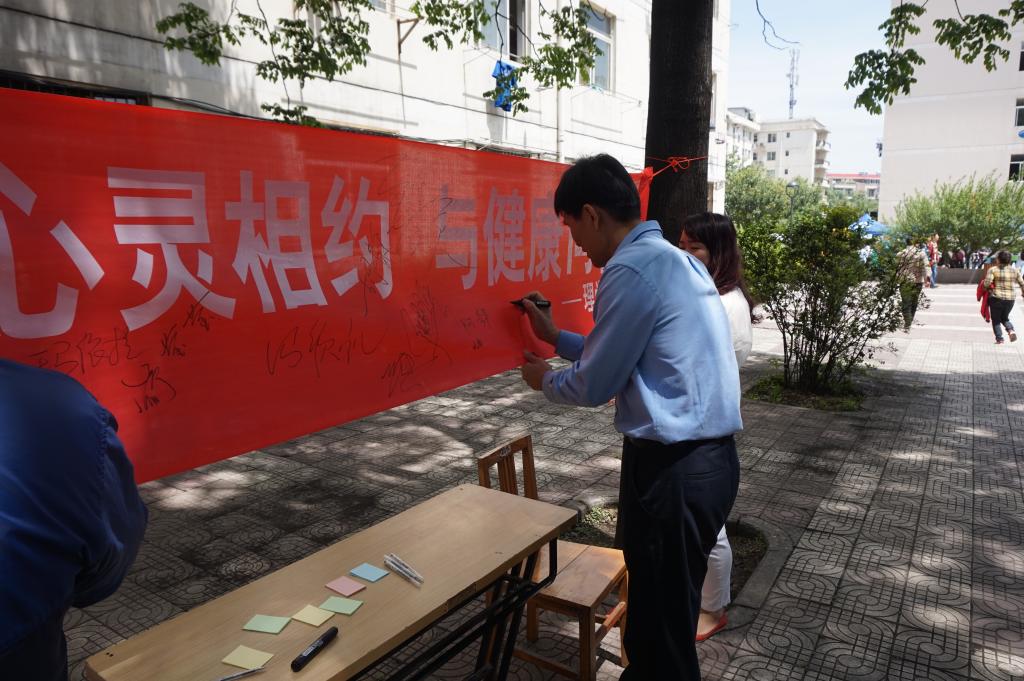 为积极开展老员工心理健康教育宣传,给员工提供一个展示自我、分享阳光心灵的舞台,SUNBET申博举办了“心灵之约”心理健康征文比赛,并于5月17日中午在榴馨苑门前对优秀作品进行展示。SUNBET申博公司党委书记张冬生、经理李明、党委副书记贾哲亲临现场指导,在题为“与心灵相约、与健康同行”的心理健康横幅上,与员工一起签名留念,以此倡导老员工应关注、关心、关爱心理健康教育。