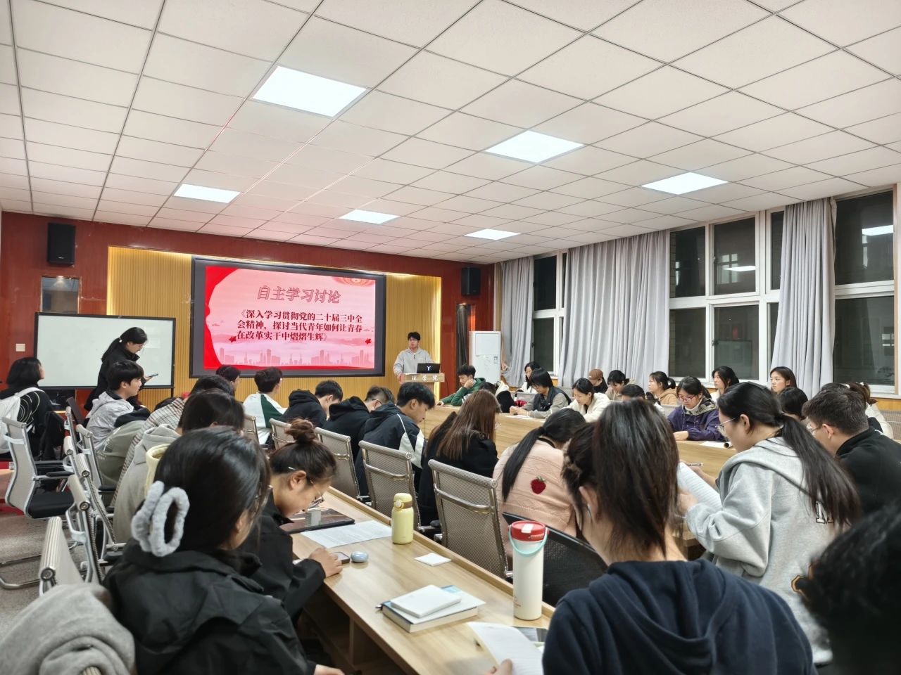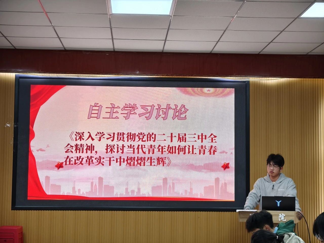 为进一步加强党性教育,11月18日,SUNBET申博于208会议室组织了主题为“深入学习贯彻党的二十届三中全会精神,探讨当代青年如何让青春在改革实干中熠熠生辉”的入党积极分子自主学习讨论活动,并观看了“党史学习教育”党性教育影片,本次活动由院团委组织部副部长汪夏禹主持。