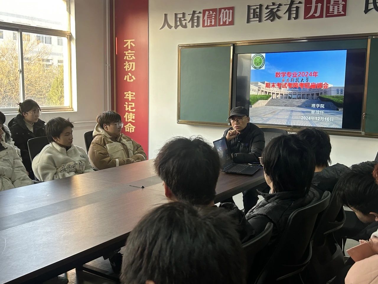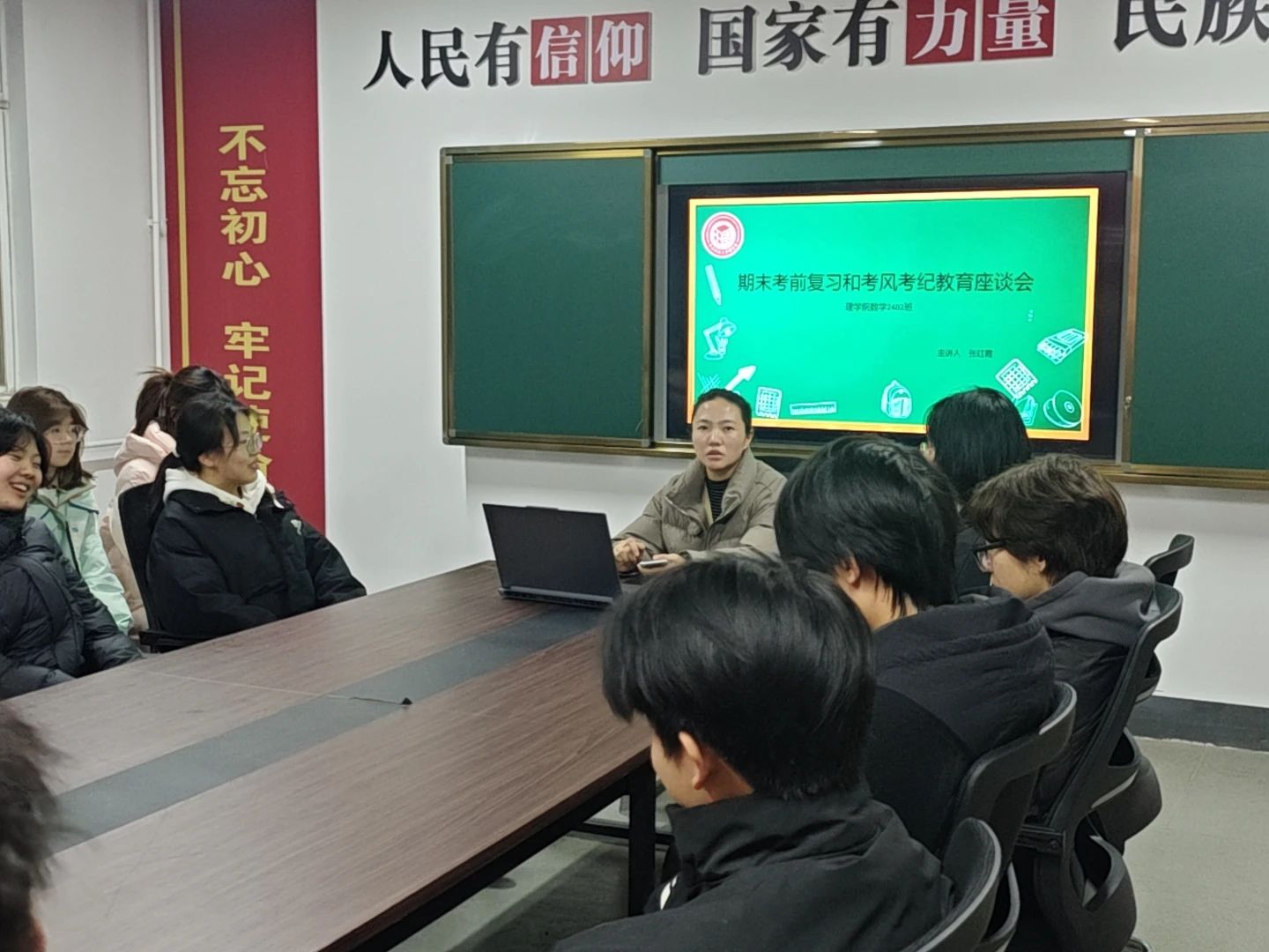12月16日,SUNBET申博于“一站式”员工社区举办了期末考试考风考纪座谈会,本次座谈会由数学与应用数学2401班班主任姬战怀主持,数学与应用数学2401班参加。