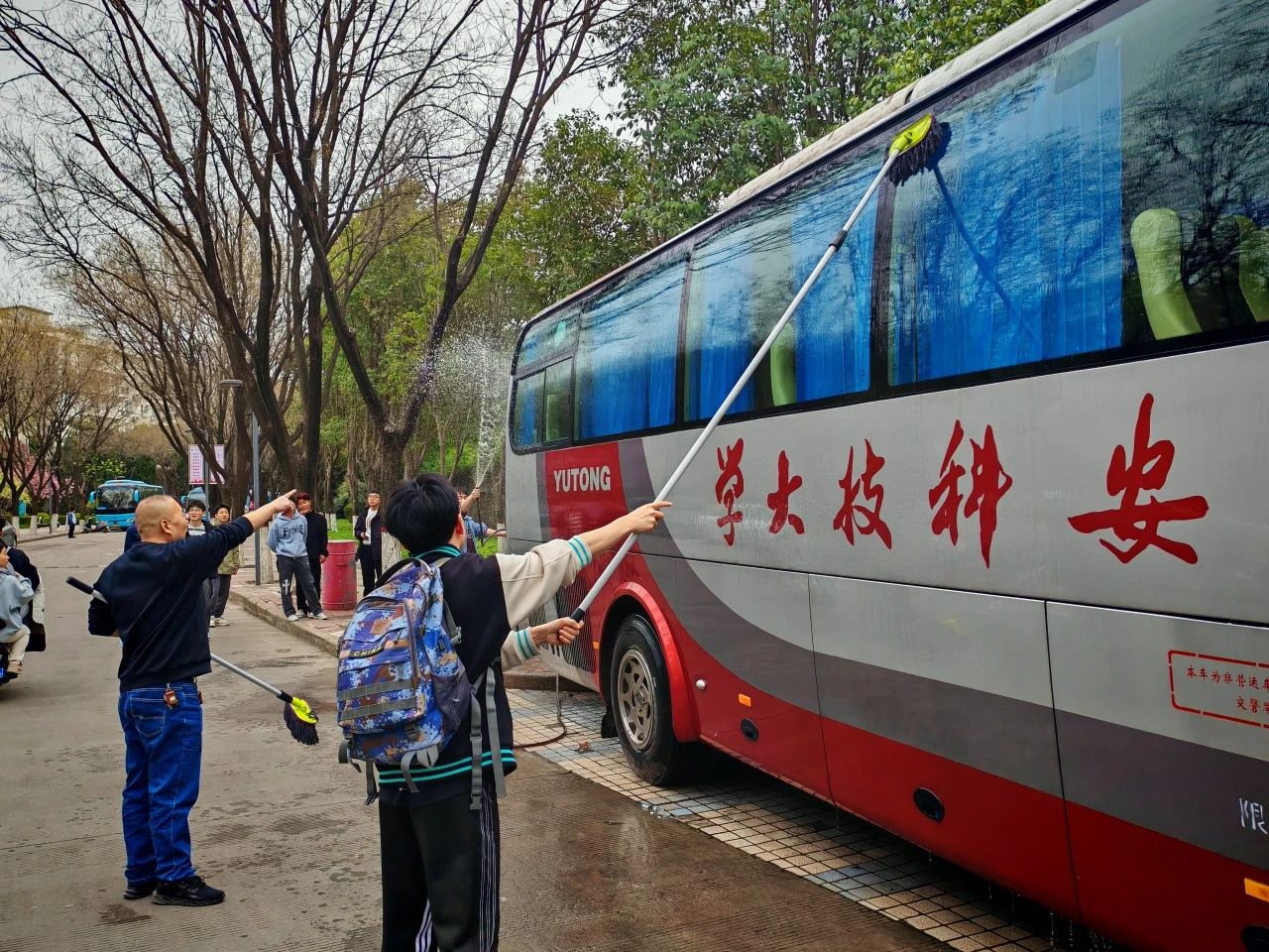 志愿者们准时在校车停放处集合,用浸湿的抹布,认真擦拭车窗、座椅、扶手以及车内的各个角落。经过一下午的不懈努力与辛勤劳动,原本沾满灰尘的校车焕然一新。车身在阳光的照耀下闪闪发亮,车内的座椅、扶手洁净如新,志愿者们的脸上都洋溢着自豪与满足的笑容。