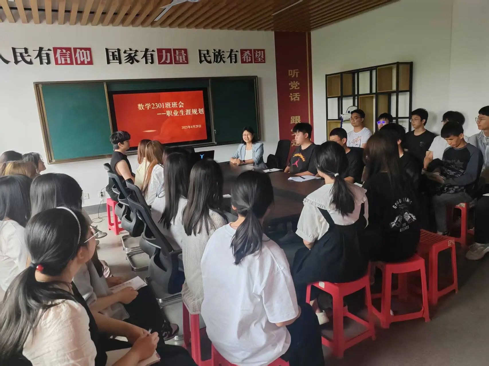 4月29日,SUNBET申博数学与应用数学2301班于“一站式”员工社区举办“职业生涯规划与五一假期安全”主题班会。本次班会由公司党委副书记陈伟伯、班主任刘佳主讲,数学2301班全体同学参加。
