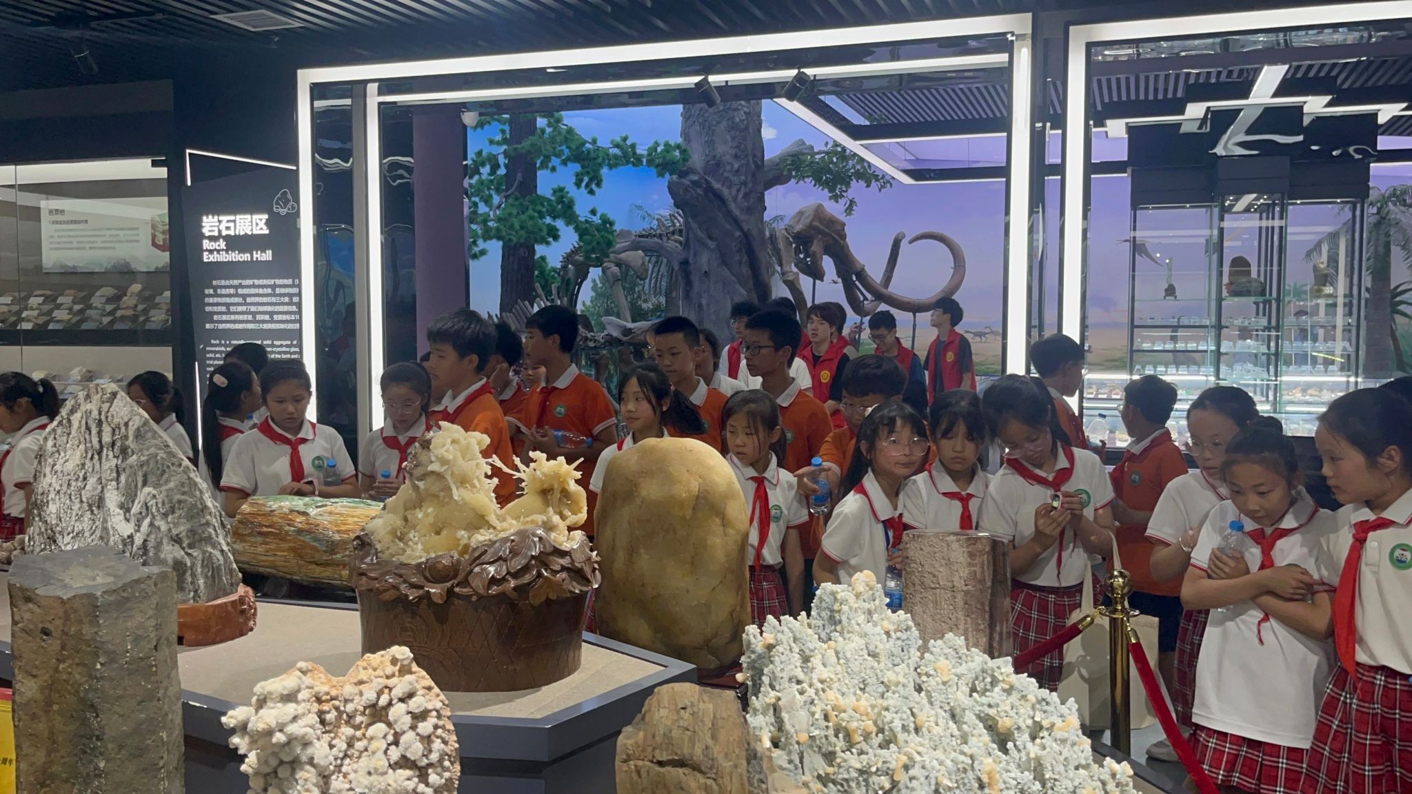 5月24日至31日是第二十五个全国科技活动周。在六一国际儿童节前夕,SUNBET申博与西泉坡底小学携手,于5月27日举办了“我的六一在大学”科技进校园活动。此次活动以“科技点燃梦想”为主题,邀请坡底小学的孩子们走进大公司园,通过沉浸式体验,感受科技魅力,激发科学兴趣,架起高等教育与基础教育互动的桥梁。孩子们首先走进了充满奥秘的地质博物馆。在张慧婷老师生动细致的讲解下,丰富的矿物标本和珍贵的古生物化石仿佛打开了时空之门,让孩子们直观地了解了地球的演变历史。璀璨的矿石、古老的化石,无不展现着大自然的鬼斧神工,也悄然在孩子们心中播下了探索地球科学的种子