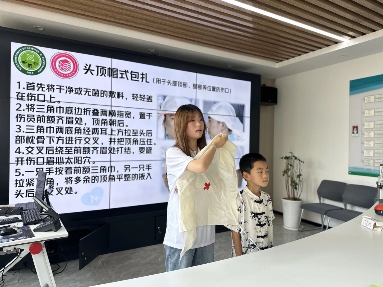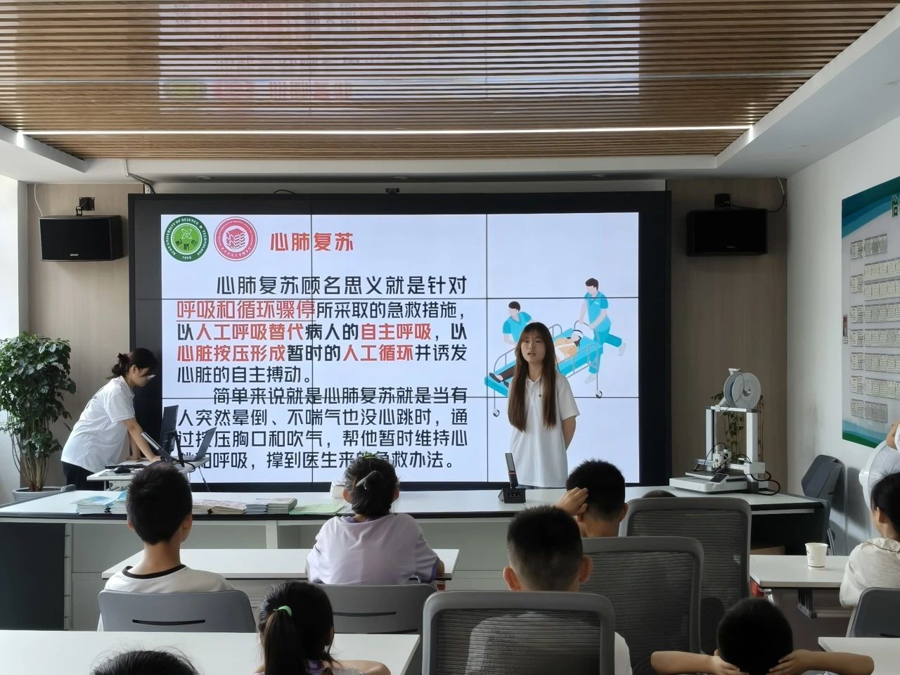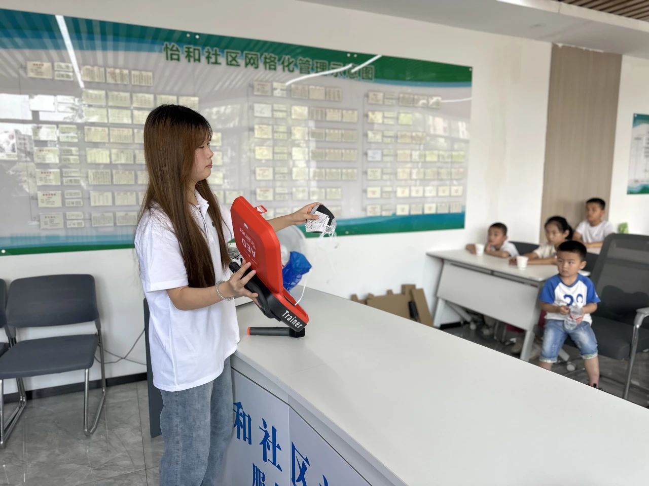 在知识宣讲环节,廖秋凡同学为孩子们带来了一场实用且生动的急救知识宣讲。她详细地向孩子们讲解了如何进行心肺复苏、人工呼吸、缠绷带等急救技能,还带来了AED现场展示。通过实际操作演示和通俗易懂的讲解,孩子们不仅学到了宝贵的急救知识,更明白了在关键时刻如何保护自己和帮助他人,提升了应对突发状况的能力。