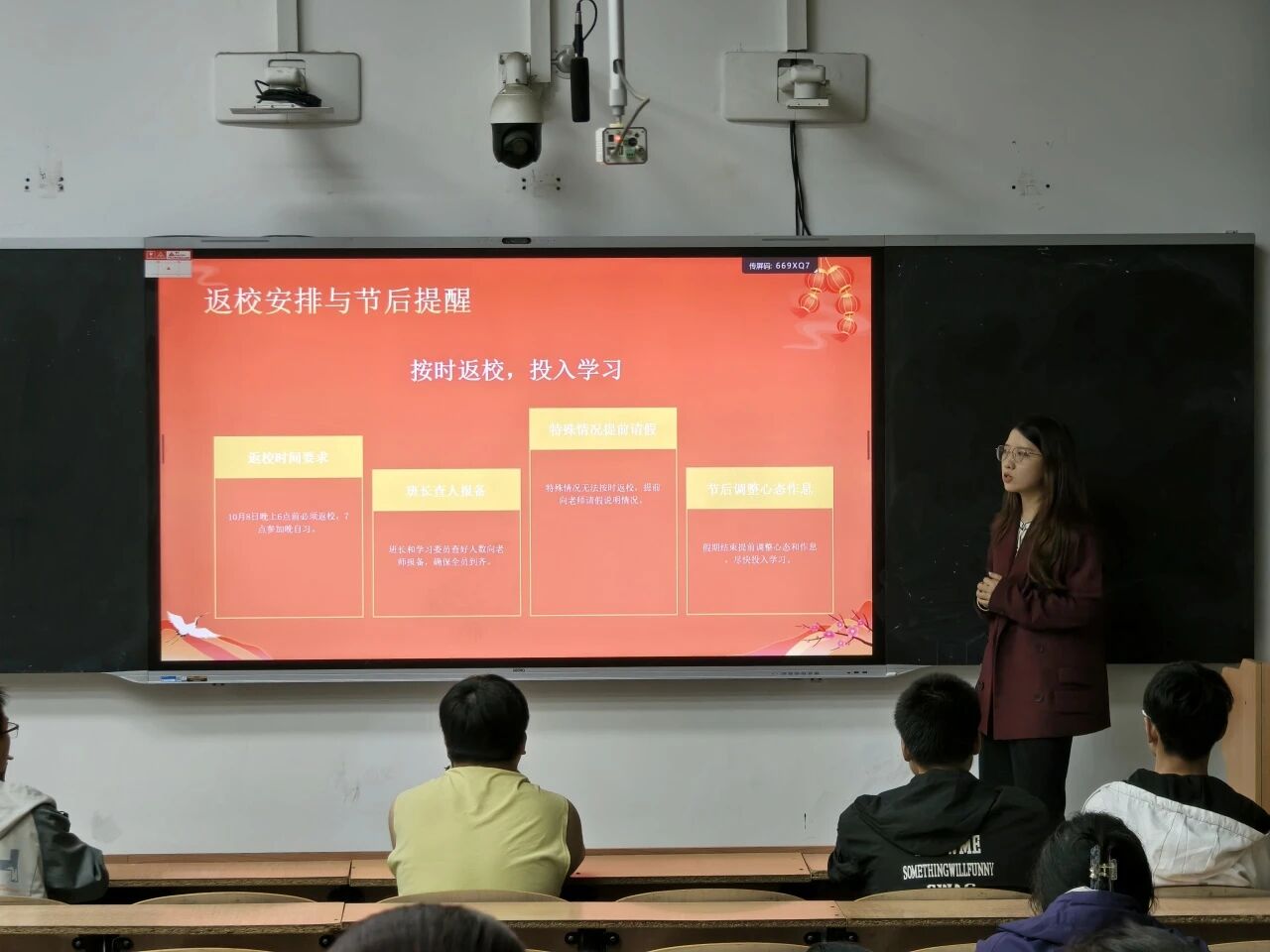段佳重点围绕人身安全、财产安全、交通安全和网络安全等多个方面进行了详细阐述。她要求同学们离校前务必对宿舍进行安全检查,消除火灾隐患;返乡或外出旅途中要选择正规交通工具,时刻注意人身和财物安全;留校同学要严格遵守宿舍管理规定,保持信息畅通。同时,她特别提醒同学们在享受网络便利的同时,要警惕电信网络诈骗,不轻信、不转账、不透露个人信息,切实提高防范能力。